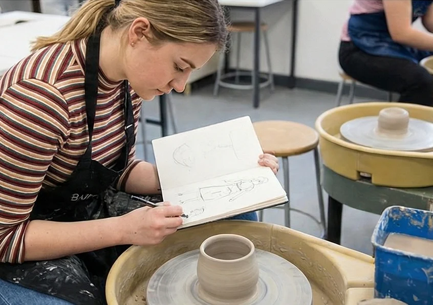 You’ll work in open-plan art studios with access to 2D, 3D and digital resources. This includes paint, sculpture materials, printmaking tools, cameras, software (Adobe Creative Suite), and access to greenscreen and media studios. All sketchbooks and key materials are provided for free to support your exploration.